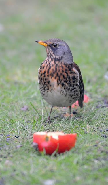 With plenty of reports of winter thrushes turning up in gardens during the recent snowfall, I cut up a few cheap, old apples and stuck them on the lawn, in the hope that they would do the trick and bring in a few Fieldfare.